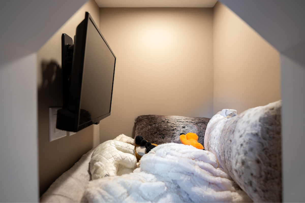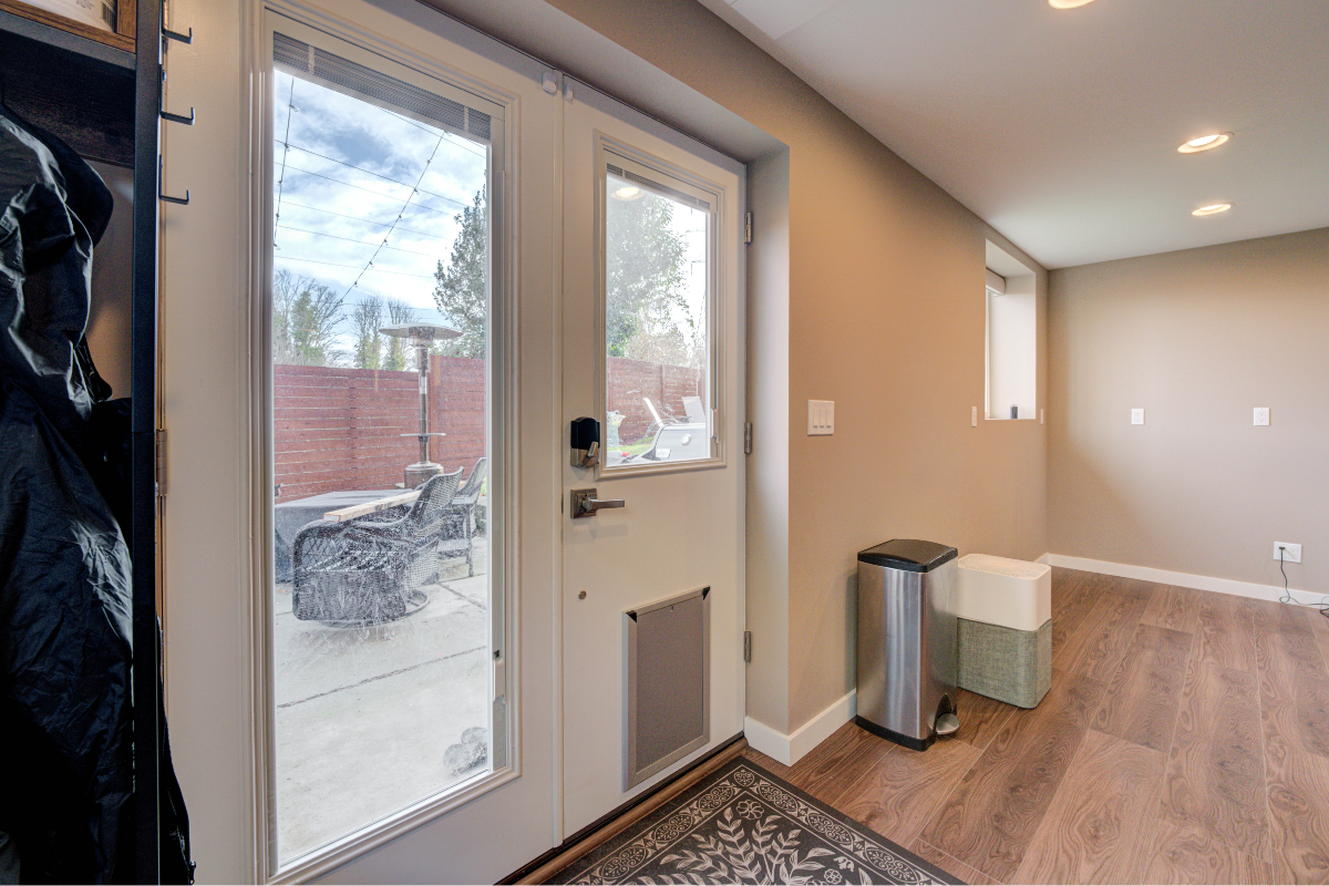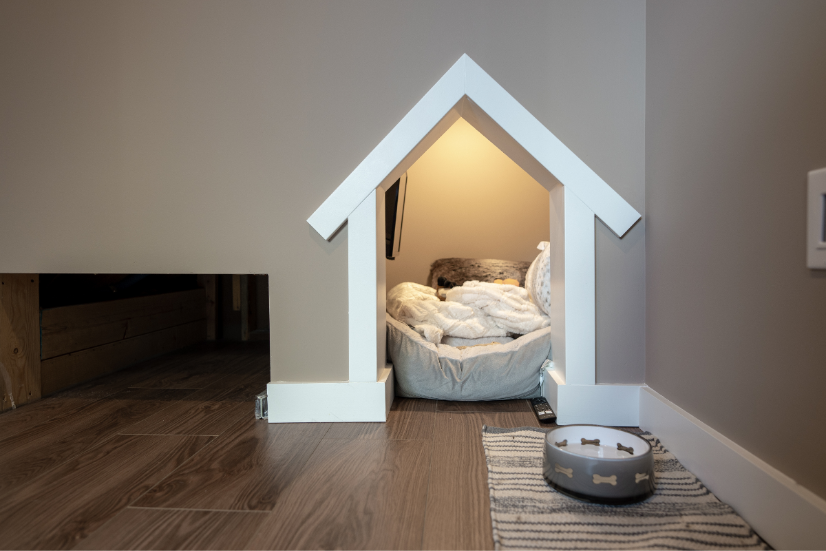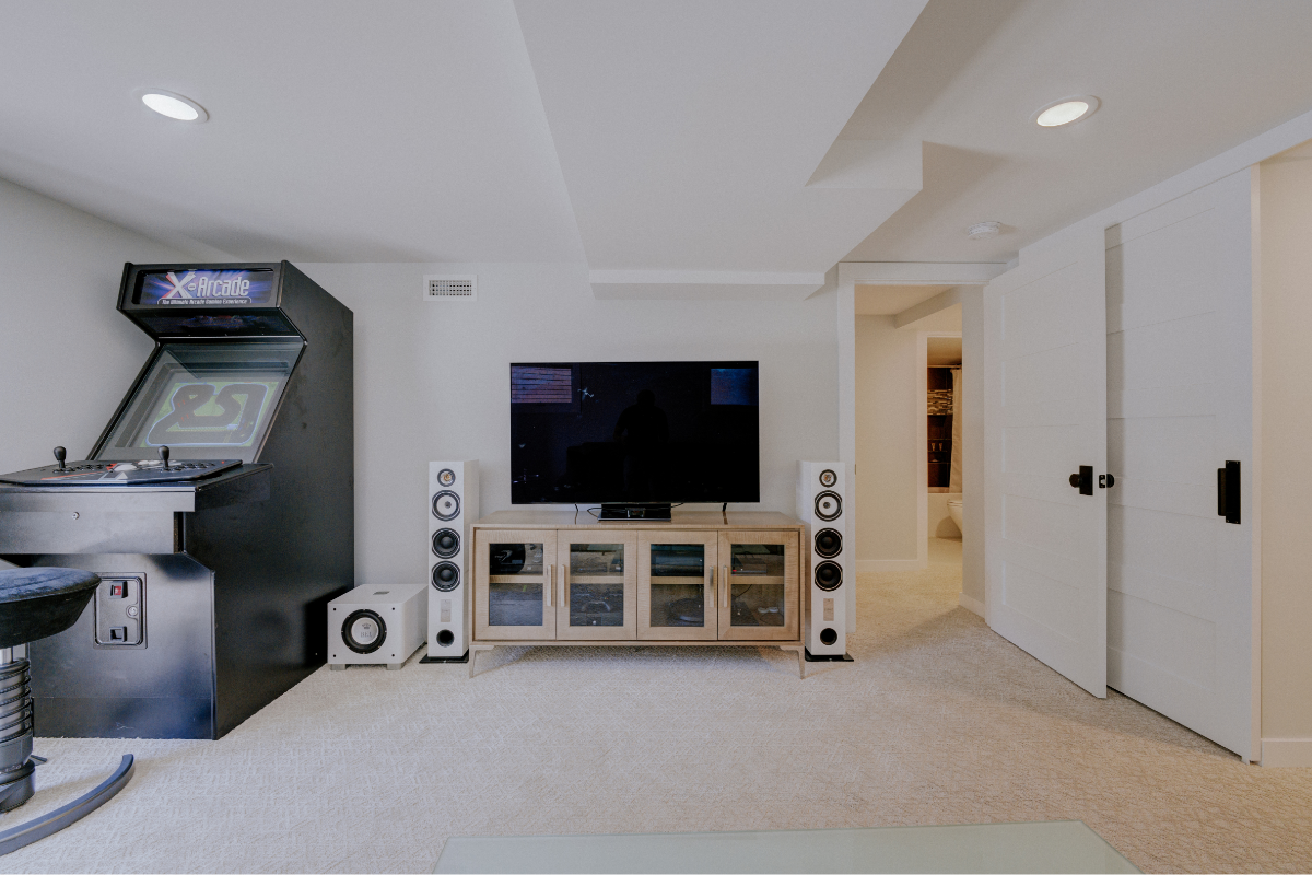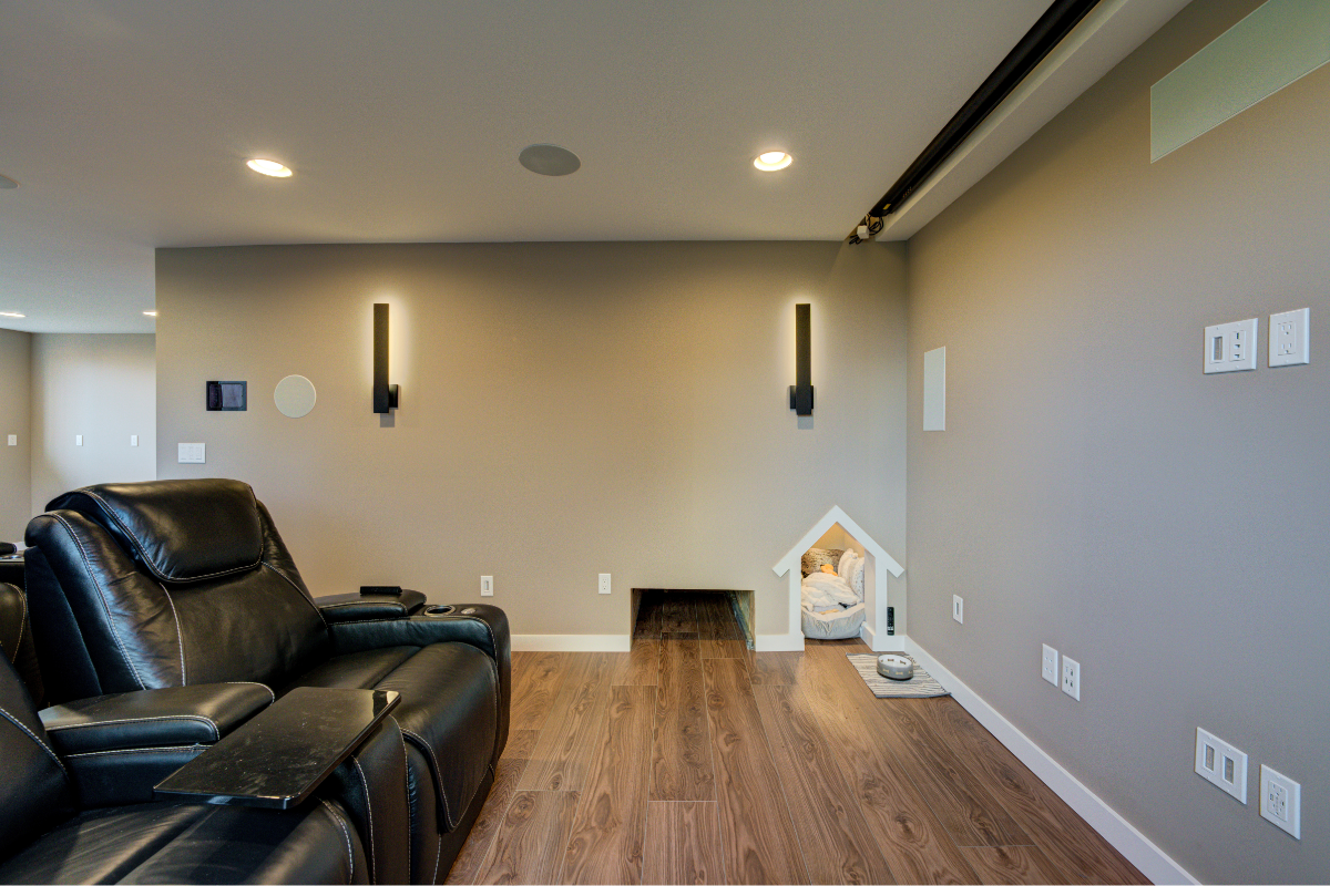 No detail was overlooked, not even for the family’s four-legged member. A cozy nook with its own screen for “dog TV” and a convenient doggy door to the backyard were added, ensuring that every member of the household had a place of their own. The finished result is a basement that brings comfort, entertainment, and a touch of whimsy to everyday living.
