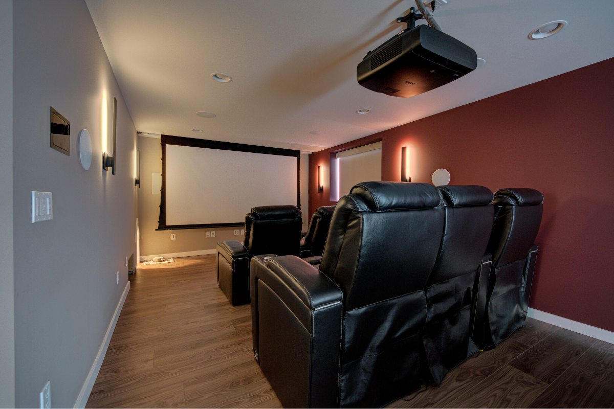 A private bedroom and full bath were created for the mother-in-law, making extended visits comfortable and welcoming. The rest of the basement was designed for fun and connection — a card table for late-night games, and a custom in-home theater where friends and family can gather to watch the big game.