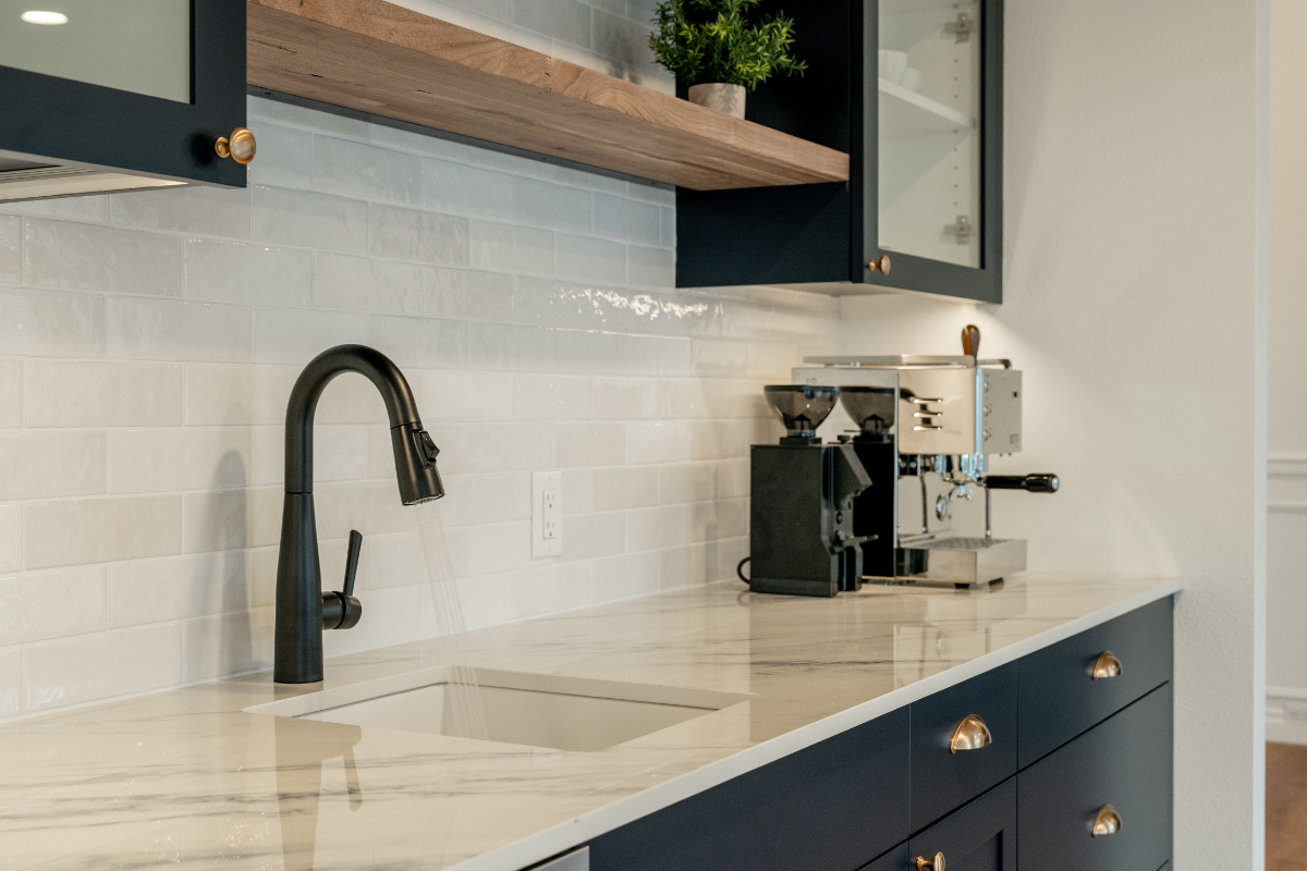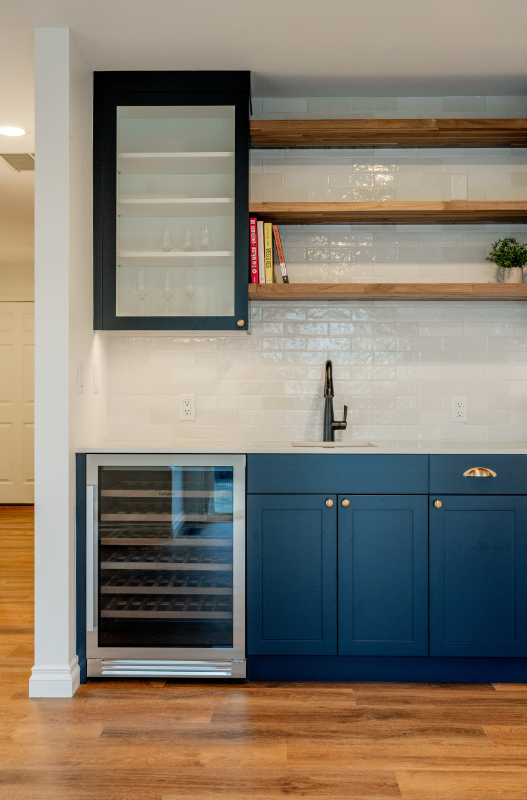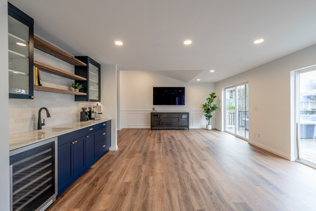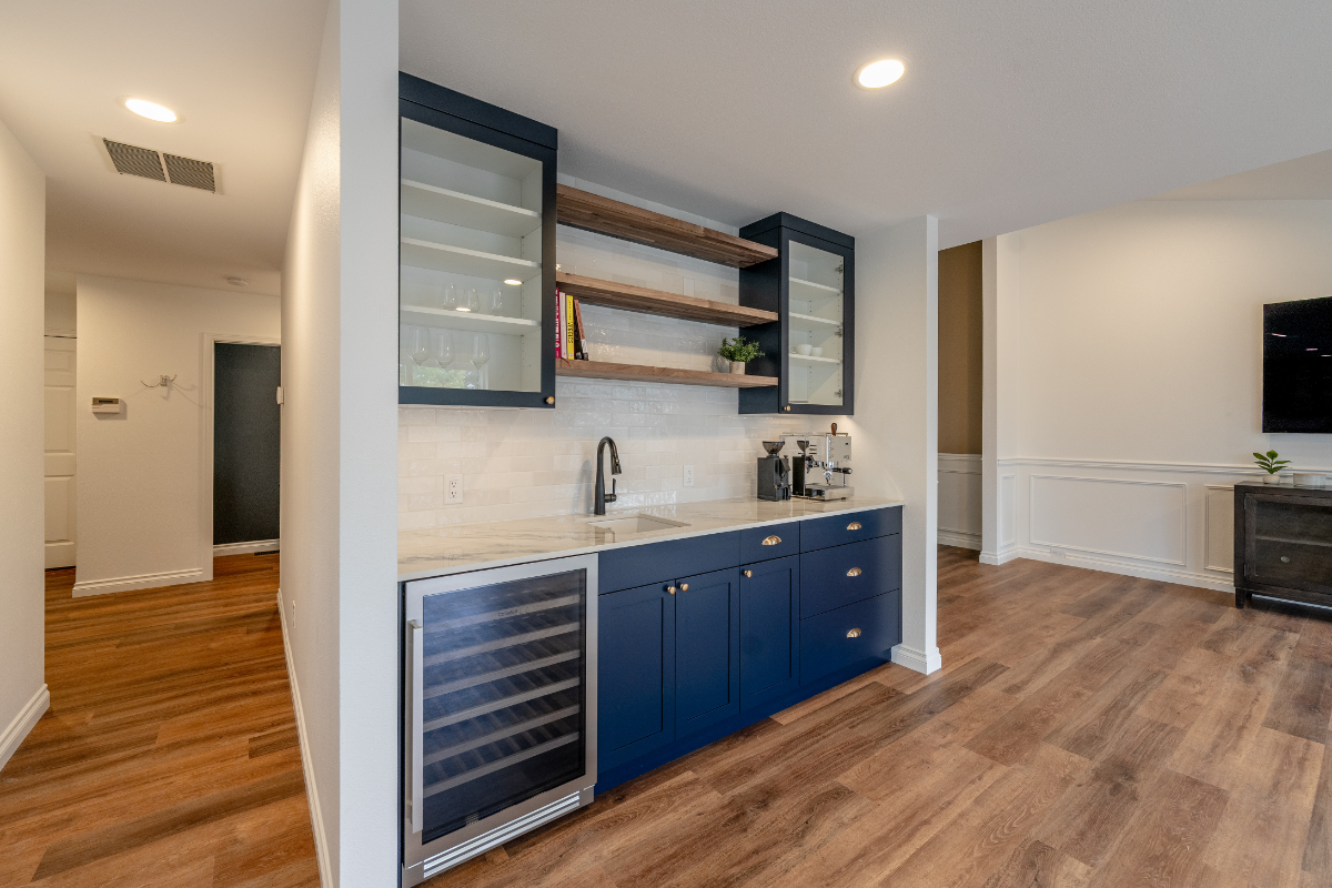 A custom wet bar and entertainment area anchors the space, including a dedicated coffee station designed around the homeowner’s espresso machine. The result is a home that feels open, social, and personal, designed around how the homeowner actually lives and hosts.