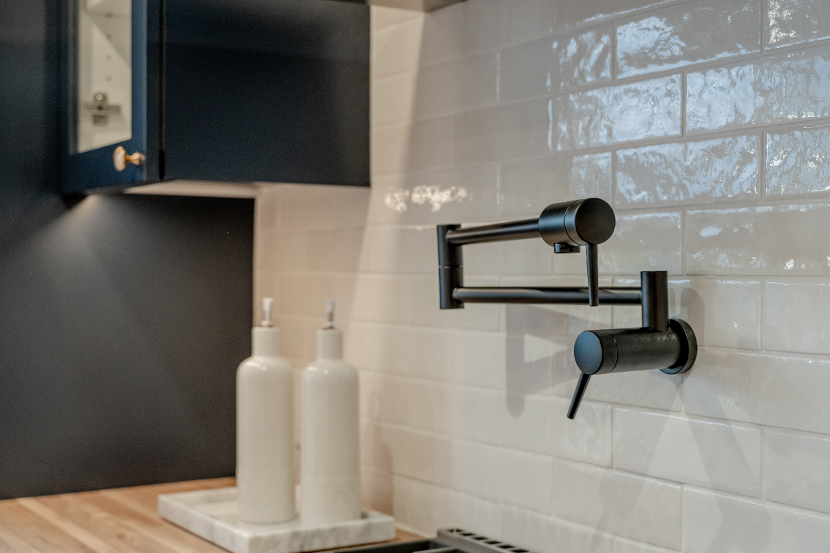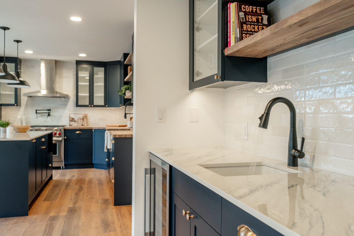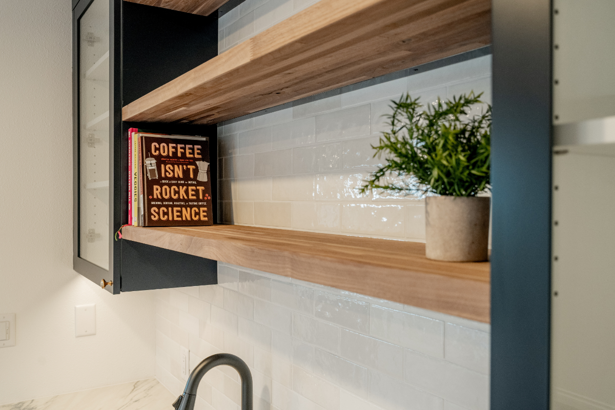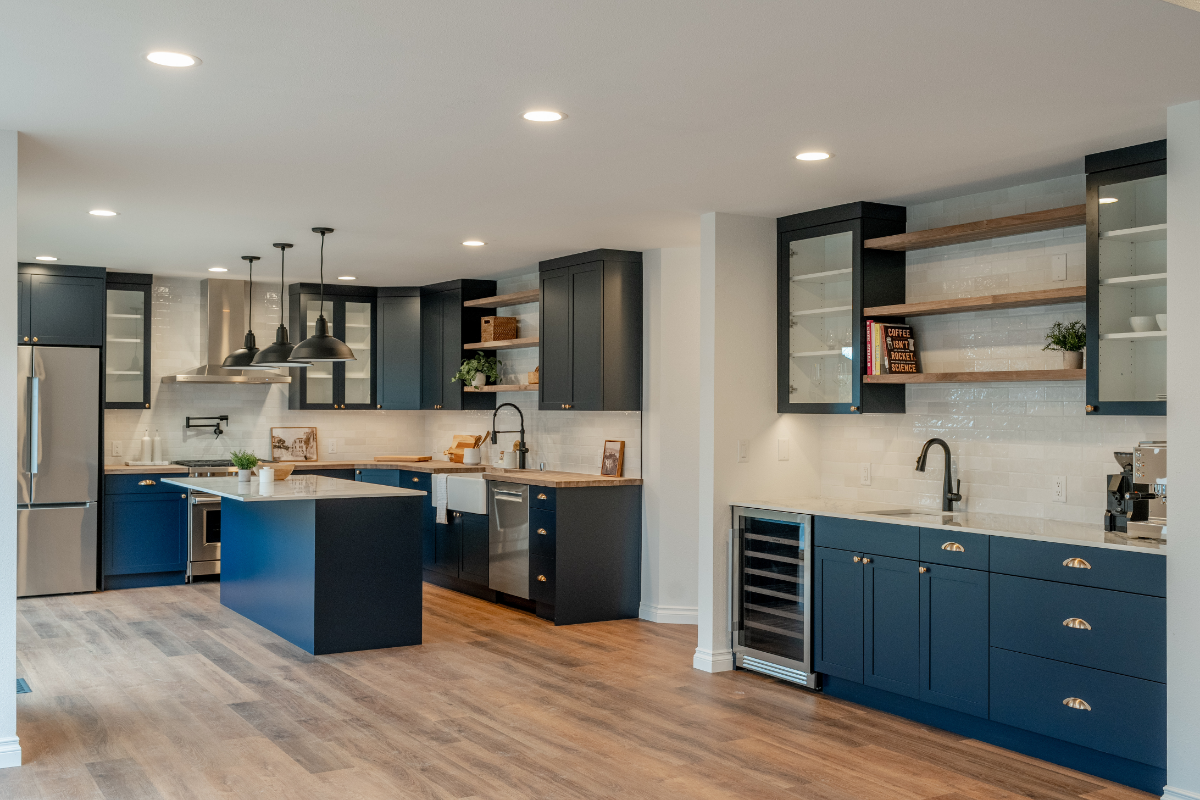 A custom wet bar and entertainment area anchors the space, including a dedicated coffee station designed around the homeowner’s espresso machine. The result is a home that feels open, social, and personal, designed around how the homeowner actually lives and hosts.